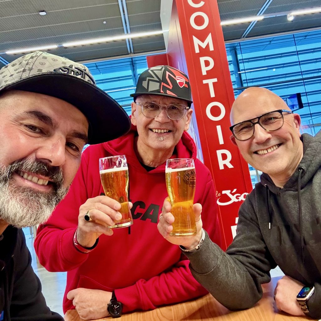 Mais on arrive avec 1 heure et demi de retard et il faut se rendre à l’évidence, nous devrons nous contenter d’une bière pendant que les autres finiront leur repas car les cuisines sont fermées. Pas grave, on rencontre enfin Fabien Rézé, le responsable presse et communication de Ducati France, organisateur de la rencontre et on fait connaissance avec nos homologues des autres DOCs.