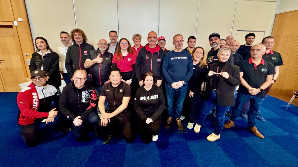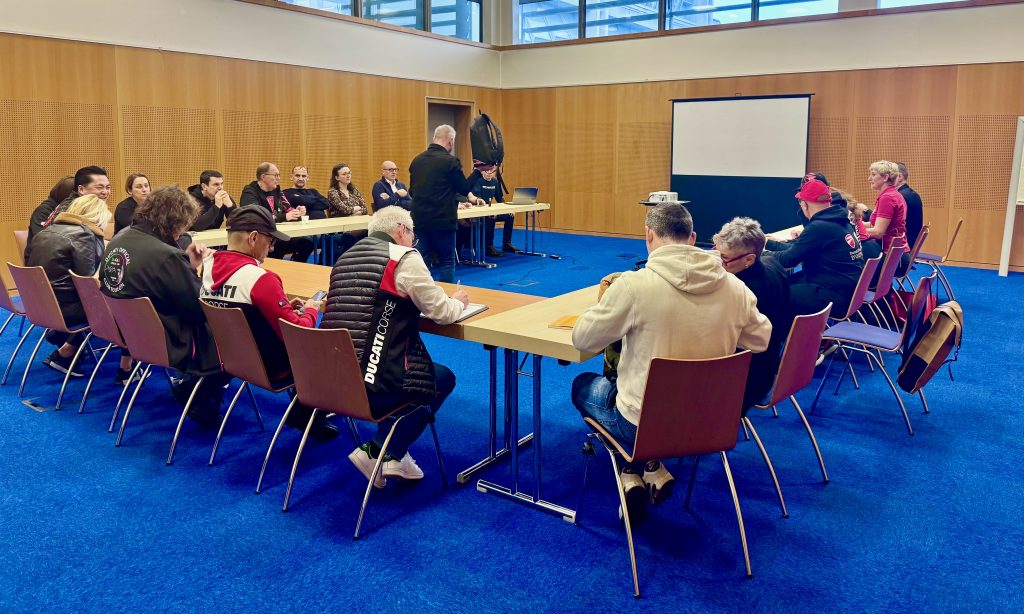10 heures, la réunion des présidents commence mais je ne m’étendrais pas sur son contenu car cela fera l’objet d’un compte-rendu spécifique. Fabien Rézé (responsable presse et communication Ducati France), Maxime Loiseau (directeur Ducati West Europe) et Tom Dessertenne (directeur marketing et communication Ducati West Europe) assurent la présentation, répondent aux questions et gèrent les débats.